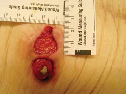 This patient's ulcerating lesion is characteristic of pyoderma gangrenosum (PG). PG is an uncommon skin disease characterized by intense neutrophilic inflammation and invasion of the skin. Lesions are classically ulcerated, but PG may also present with bullae, pustulonodules, and vegetative plaques. Typical lesions begin as painful pustules that rapidly ulcerate and expand, with an edematous, rolled, or undermined-appearing border that may have a violaceous hue. Annular rings are sometimes noted. As with other neutrophilic dermatoses, when the process is active, approximately 25% of patients will exhibit pathergy or induction of new lesions at sites of trauma, including ostomy, phlebotomy, and intravenous sites. Peristomal PG, occurring around ostomy sites, is common and can be challenging to manage. As PG resolves, it tends to heal with atrophic scarring in a cross-like or cribriform pattern. There are no definitive diagnostic tests, and PG is a diagnosis of exclusion. Skin biopsy may be required to exclude other diseases such as cutaneous Crohn disease but may cause worsening of the PG. Treatment can be challenging, and if there is an associated underlying disease, therapy should be directed at controlling that process. Extraintestinal manifestations such as oral aphthous ulcers, arthralgia, inflammatory eye diseases, and PG are seen in approximately 10% of patients with inflammatory bowel disease.